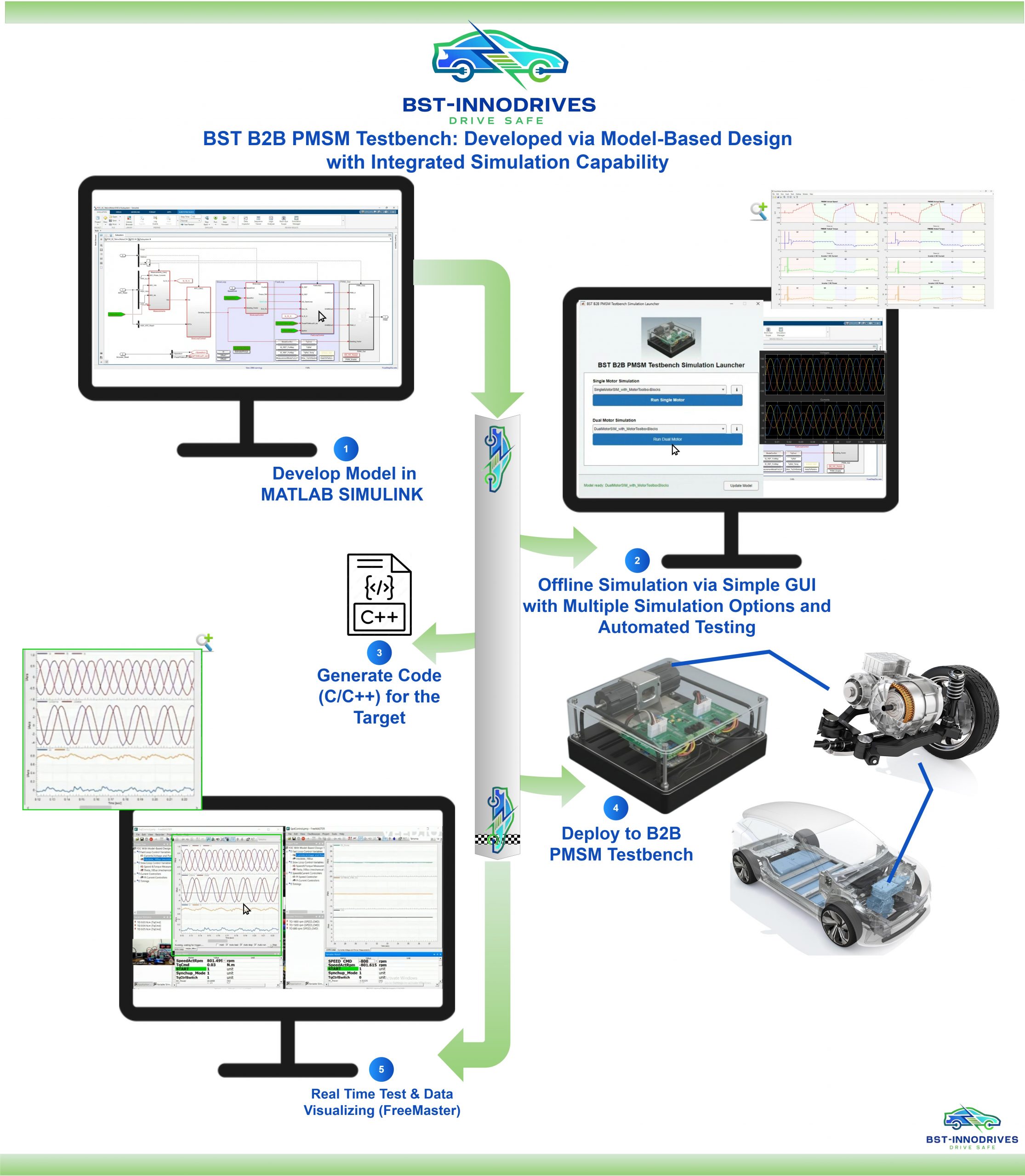 • Unified Workflow: Seamless transition from Simulink model → C code → Hardware-in-the-Loop → Physical testbench